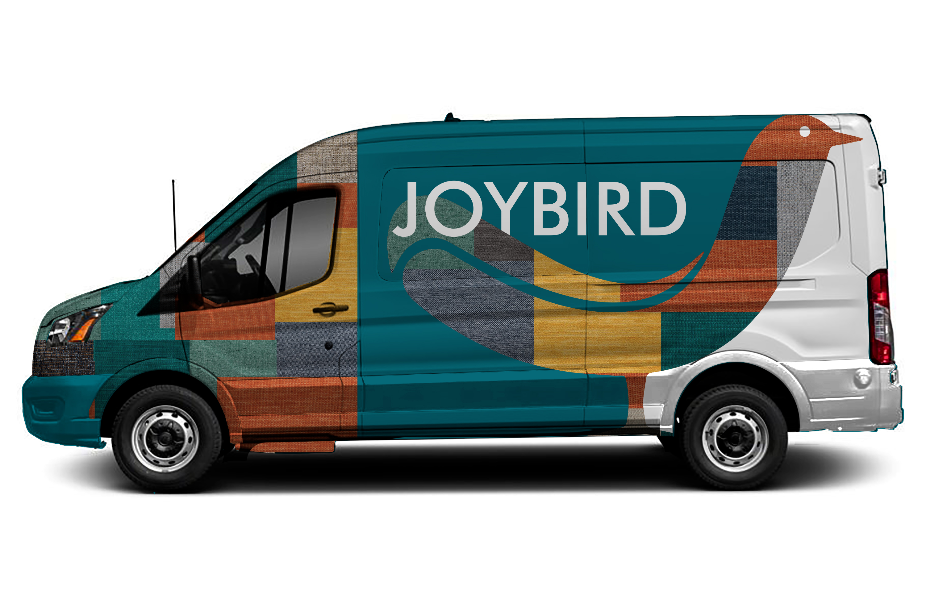 A cleaner, more conservative backup option, this concept used Joybird’s primary color as a full-vehicle flood with large, bold logo placement for visibility and impact.